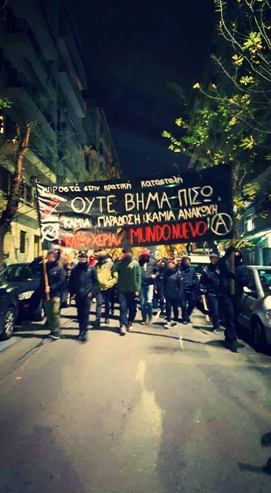 Στις 20 Νοεμβρίου έχει οριστεί το δικαστήριο για την υπόθεση της κατάληψης Mundo Nuevo. Στην περίπτωση της κατάληψης Mundo Nuevo επιχειρήθηκε να εισαχθεί ένα νέο κατασταλτικό δόγμα. Η ασφάλεια Θεσσαλονίκης και συγκεκριμένα το τμήμα πολιτεύματος αρχικά κάλεσε 16 άτομα σε προανακριτική εξέταση για να εξακριβωθεί η σχέση των ατόμων αυτών με την κατάληψη. Το μοναδικό κριτήριο για να εμπλακούν τα 16 αυτά άτομα είναι κάποιες εξακριβώσεις που πραγματοποιήθηκαν το τελευταίο διάστημα σε όλη την πόλη της Θεσσαλονίκης! Αυτή η μέθοδος σε άλλες εποχές ίσως θεωρούνταν φάρσα και θα προκαλούσε θυμηδία αν δεν είχε από πίσω ένα σοβαρό διακύβευμα. Ο στόχος κατ΄ εμάς είναι η κοινωνική απομόνωση της κατάληψης μέσω της τρομοκράτησης όποιου θέλει να έρθει σε επαφή με τις καταλήψεις και με τις ελευθεριακές αναρχικές ιδέες εν γένει. Από την άλλη, χρησιμοποιώντας αυτό το γελοίο κατηγορητήριο οι μπάτσοι δεν χάνουν την ευκαιρία να στοχοποιήσουν αναρχικούς συντρόφους γνωστούς για την μακροχρόνια δράση τους.