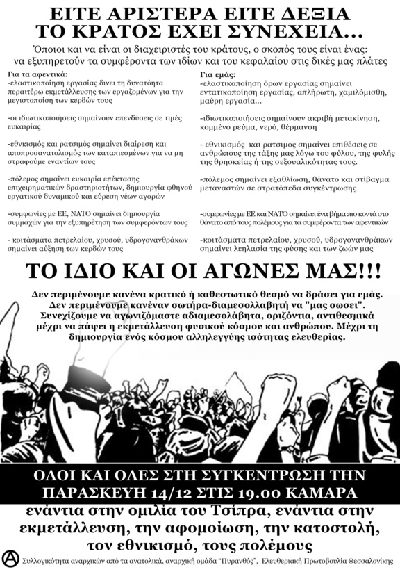 Να σταματήσουμε να ψάχνουμε την ευθύνη στις κυβερνήσεις και τη λύση στις εκλογές. Το σύνολο της ευθύνης ανήκει ολοκληρωτικά στον κρατισμό και η λύση είναι οι αδιαμεσολάβητοι αντιθεσμικοί αγώνες για την οικοδόμηση μιας κοινωνίας ισότητας, αλληλεγγύης και αυτοδιάθεσης. Την Παρασκευή 14 Δεκέμβρη στις 19:00 όλοι και όλες στην Καμάρα ενάντια στις εκλογικές αυταπάτες και τον κρατισμό. Ενάντια στην εκμετάλλευση, τον φασισμό και τους πολέμους που γεννά.