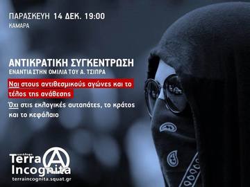 Στις 14/12/18, ο πρωθυπουργός της χώρας Α. Τσίπρας πρόκειται να πραγματοποιήσει ομιλία στο Παλέ ντε Σπορ, προσπαθώντας να κερδίσει έδαφος για τις επερχόμενες εκλογές. Επιχειρώντας να αντιπαρατεθεί στον συντηρητισμό της αξιωματικής αντιπολίτευσης, ο ΣΥ.ΡΙΖ.Α. προσπαθεί να βάλει στην ατζέντα του έναν κακώς επιτηδευμένο θεσμικό «αντιφασισμό» (παρόλο που συγκυβερνά με τους ακροδεξιούς ΑΝ.ΕΛ. και συνεχίζει ακατάπαυστα την αντιμεταναστευτική πολιτική των προηγούμενων κυβερνήσεων, όπως και τις περιοδείες σε ακριτικά νησιά από κοινού με αντιπροσώπους της νεοναζιστικής Χρυσής Αυγής), αλλά και τον υποτιθέμενα «προοδευτικό πατριωτισμό», σε μια τραγελαφική προσπάθεια μονομερούς επανένταξής του στους κόλπους του ταξικού κινήματος. Ο ΣΥ.ΡΙΖ.Α., ως διαχειριστής της κρατικής εξουσίας και πολιτικό προσωπικό του κεφαλαίου, που εξοντώνει με αβάσταχτα μέτρα λιτότητας την κοινωνική βάση, που προσφέρει απλόχερα εκδούλευση στον ευρωατλαντικό ιμπεριαλισμό μετατρέποντας όλη την επικράτεια σε προκεχωρημένο φυλάκιο του ΝΑΤΟ στα Βαλκάνια και την Ανατολική Μεσόγειο με απώτερο σκοπό την εξυπηρέτηση των ενεργειακών συμφερόντων μονοπωλιακών ομίλων και την προώθηση των διακρατικών ανταγωνισμών, δεν μπορεί παρά βάσει της υλικής πραγματικότητας που βιώνουν με τον πλέον ειδεχθή τρόπο οι από τα κάτω, να αποτελεί ταξικό εχθρό των καταπιεσμένων και εκμεταλλευόμενων.