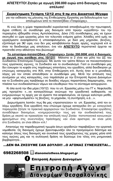 Συνάδελφοι ο αγώνας καθενός από εμάς είναι αγώνας όλων μας. Υπερασπιζόμενοι τους συναδέλφους μας, κόβουμε το βήχα σε πιθανούς μιμητές ξυλοδαρμών, παράνομων απολύσεων, κλοπή δώρων κτλ.