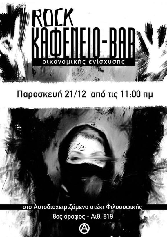 Rock καφενείο-bar οικονομικής ενίσχυσης στο αυτοδιαχειριζόμενο στέκι φιλοσοφικής (αίθουσα 819). Παρασκεύη 21 Δεκεμβρίου από τις 11.οο π.μ.