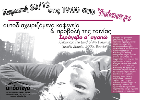 Προβολή της ταινίας Σεράγεβο σ΄Αγαπώ της Βόσνιας σκηνοθέτιδας Jasmila Zbanic στο πλαίσιο του Κυριακάτικου καφενείου. Θα υπάρχει καφές και μπύρες καθώς και δανειστική βιβλιοθήκη/κινηματικό βιβλιοπωλείο.