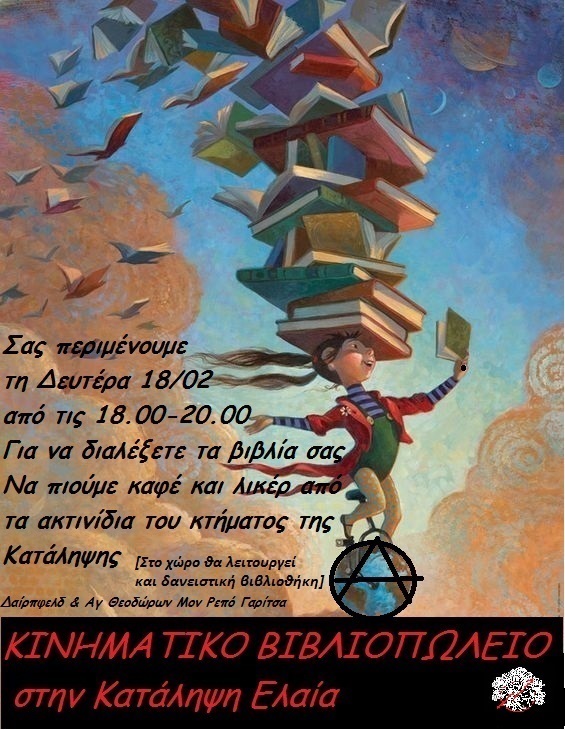 Σας περιμένουμε την Δευτέρα 18/02/19 από τις 18:00 έως τις 20:00, για να διαλέξετε τα βιβλία σας, να πιούμε καφέ και λικέρ από ακτινίδια του κτήματος της κατάληψης.