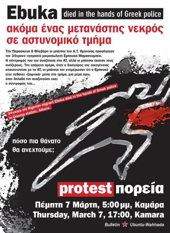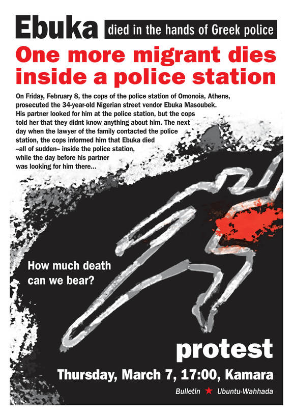 Στις 8 Φεβρουαρίου ο Ebuka αφρικανός μετανάστης και πατέρας 2 παιδιών που εργαζόταν ως μικροπωλητής προσάγεται από μπάτσους εν ώρα εργασίας και μεταφέρεται στο ΑΤ Ομόνοιας. Ενώ είναι δεμένος με χειροπέδες βρίσκεται νεκρός μέσα στο αστυνομικό τμήμα κάτω από «αδιευκρίνιστες συνθήκες». Οι μπάτσοι έκρυψαν το θάνατο του Εμπουκά για 24 ώρες από την οικογένεια του και με απίστευτη κυνικότητα ζήτησαν από την γυναίκα του να κάνει δήλωση εξαφάνισης, ενώ οι ίδιοι προωθούσαν την απέλαση της σωρού του στην Νιγηρία. Η γνωστοποίηση του θανάτου του Εμπουκά ξεκίνησε από την Οργάνωση Ενωμένων Γυναικών Αφρικής. Η ανακοίνωση έγραφε: «Ένας άνδρας από τη Νιγηρία, από την κοινότητά μας, δολοφονήθηκε πριν λίγες μέρες στην Ομόνοια από την ελληνική αστυνομία. Χρειάζεται να βγούμε έξω και να φωνάξουμε».