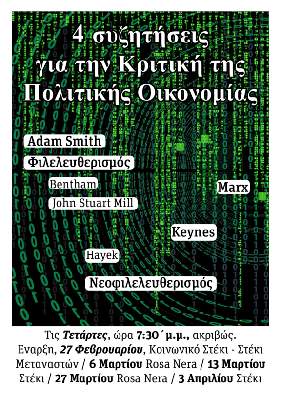 Σας καλούμε σε ένα κύκλο ανοικτών συζητήσεων με αντικείμενο βασικές ιδέες και θεωρητικές επεξεργασίες για τις κοινωνικο-οικονομικές σχέσεις που οργανώνουν τις κοινωνίες μας.