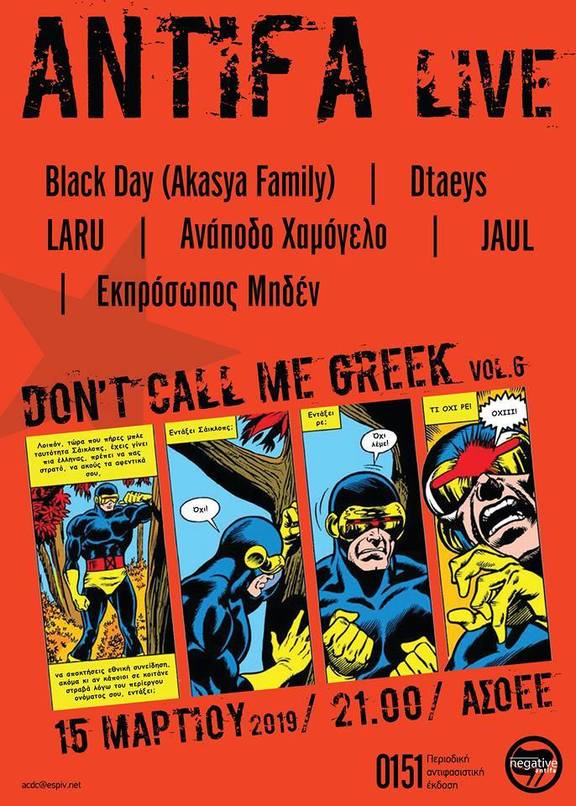 Οι συναυλίες "Don't Call Me Greek!" ανήκουν στις πολιτικές πρωτοβουλίες του antifa negative και του αντιφασιστικού περιοδικού 0151 για να ανοίξουμε χώρο και να διαδώσουμε τη χιπ χοπ μουσική συγκροτήματων και καλλιτεχνών "δεύτερης γενιάς μεταναστών" και αντιφασιστ(ρι)ών.