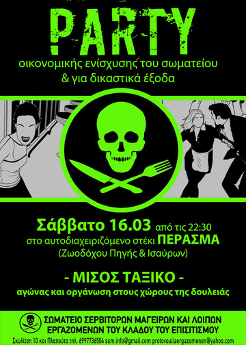 Πάρτυ οικονομικής ενίσχυσης του Σωματείου, καθώς και για δικαστικά έξοδα μελών μας. Σας περιμένουμε στο Αυτοδιαχειριζόμενο Στέκι Πέρασμα (Ζωοδόχου Πηγής & Ισαύρων) το Σάββατο 16 Μαρτίου από τις 22:30.
