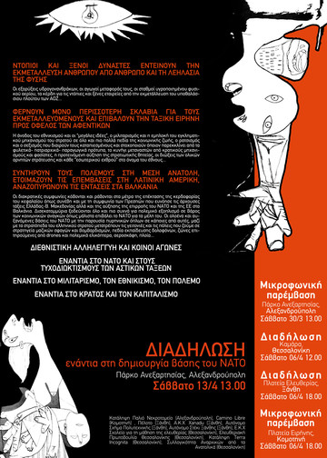 Διασυλλογική αφίσα που κολλιέται σε δρόμους της Θεσσαλονίκης, της Ξάνθης, της Κομοτηνής και της Αλεξανδρούπολης προπαγανδίζοντας τις κατά τόπους συγκεντρώσεις στις 30/3 και τις 6/4 αλλά και τη διαδήλωση ενάντια στη δημιουργία βάσης του ΝΑΤΟ στην Αλεξανδρούπολη στις 13/4.