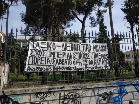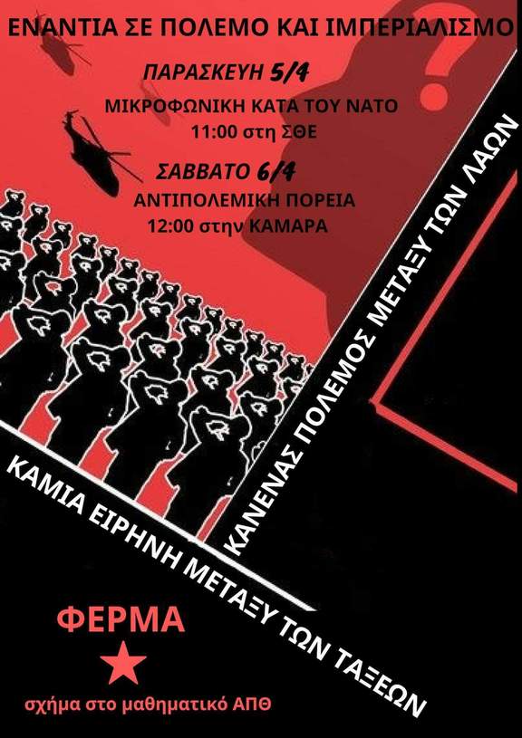 Τη στιγμή που ο ρόλος του ελληνικού κράτους βαθαίνει στους σχεδιασμούς του ΝΑΤΟ (βλ. αναβάθμιση των ήδη υπαρχουσών βάσεων και δημιουργία νέων, συμμετοχή σε ενεργειακούς και στρατιωτικούς συμμαχικούς άξονες με το Ισραήλ, την Αίγυπτο και την Κύπρο), ενώ παράλληλα οι πολεμικές μηχανές των κυρίαρχων αλλού ζεσταίνονται και αλλού δολοφονούν ανθρώπους της τάξης μας, κρίνουμε ως επιτακτική ανάγκη τη συγκρότηση ενός αντιπολεμικού-αντιμιλιταριστικού κινήματος στη βάση της προλεταριακής ενότητας και της διεθνιστικής ταξικής αλληλεγγύης.