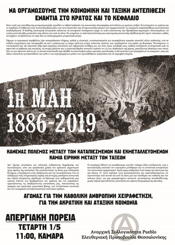 Όπως και οι σύντροφοί μας στο Σικάγο 133 χρόνια πριν, δεν ξεχνάμε πως σκοπός του αγώνα μας ως αναρχικοί/ές δεν είναι το να αποκτήσουμε όλοι ίσα δικαιώματα στη σκλαβιά ούτε να κάνουμε τις αλυσίδες μας λίγο πιο ελαφριές αλλά το να αποκαταστήσουμε πλήρως την ανθρώπινη υπόστασή μας, κάτι που μπορεί να συμβεί μόνο σε συνθήκες ισότητας, αλληλεγγύης και ελευθερίας.