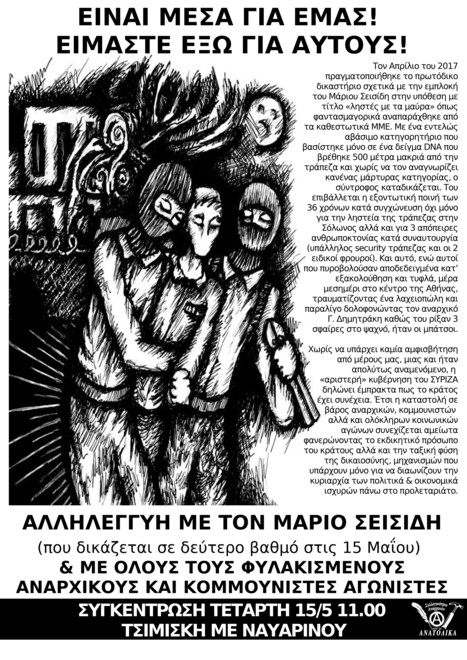 Τον Απρίλιο του 2017 πραγματοποιήθηκε το πρωτόδικο δικαστήριο σχετικά με την εμπλοκή του Μάριου Σεισίδη στην υπόθεση με τίτλο «ληστές με τα μαύρα» όπως φαντασμαγορικά αναπαράχθηκε από τα καθεστωτικά ΜΜΕ. Με ένα εντελώς αβάσιμο κατηγορητήριο που βασίστηκε μόνο σε ένα δείγμα DNA που βρέθηκε 500 μέτρα μακριά από την τράπεζα και χωρίς να τον αναγνωρίζει κανένας μάρτυρας κατηγορίας, ο σύντροφος καταδικάζεται. Του επιβάλλεται η εξοντωτική ποινή των 36 χρόνων κατά συγχώνευση όχι μόνο για την ληστεία της τράπεζας στην Σόλωνος αλλά και για 3 απόπειρες ανθρωποκτονίας κατά συναυτουργία (υπάλληλος security τράπεζας και οι 2 ειδικοί φρουροί) και σύσταση συμμορίας. Και αυτό, ενώ αυτοί που πυροβολούσαν αποδεδειγμένα κατ' εξακολούθηση και τυφλά, μέρα μεσημέρι στο κέντρο της Αθήνας, τραυματίζοντας ένα λαχειοπώλη και παραλίγο δολοφονώντας τον αναρχικό Γ. Δημητράκη καθώς του ρίξαν 3 σφαίρες στο ψαχνό, ήταν οι μπάτσοι. Η εκδίκαση αυτής της υπόθεσης σε βάρος του συντρόφου σε δεύτερο βαθμό θα πραγματοποιηθεί στις 15 Μαϊου στο εφετείο της Λουκάρεως.
