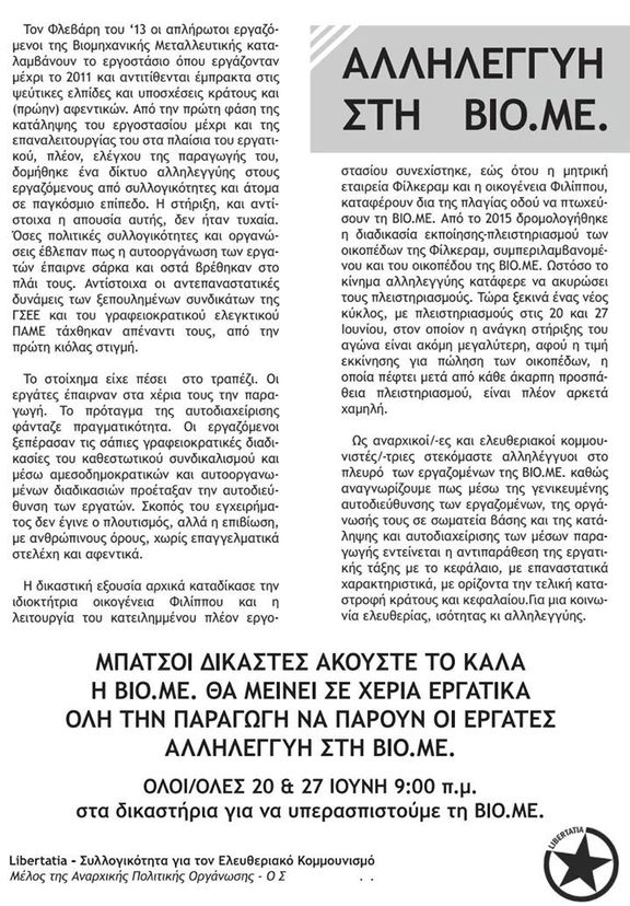 - Αλληλεγγύη και στήριξη στο αυτοδιαχειριζόμενο εγχείρημα των εργατών της ΒΙΟΜΕ για τη νίκη του δίκαιου αγώνα τους!