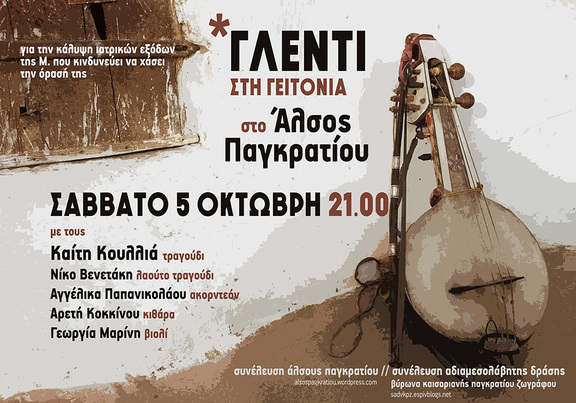 Το Σάββατο 5/10, στις 9.00μμ., στο Άλσος Παγκρατίου, θα πραγματοποιήσουμε το καθιερωμένο ετήσιο παραδοσιακό γλέντι με την Καίτη Κουλλιά και το συγκρότημά της. Τα έσοδα θα διατεθούν για την κάλυψη των ιατρικών εξόδων της Μ. που κινδυνεύει να χάσει την όρασή της από επικίνδυνη πάθηση που χρειάζεται εξειδικευμένη εγχείρηση. Γίνεται σε συνέχεια άλλων εκδηλώσεων αλληλεγγύης που έχουν πραγματοποιηθεί για τον ίδιο σκοπό. Υπολείπονται ακόμη αρκετά χρήματα οπότε κάθε πράξη ενίσχυσης και συμμετοχής στο γλέντι είναι ευπρόσδεκτη.