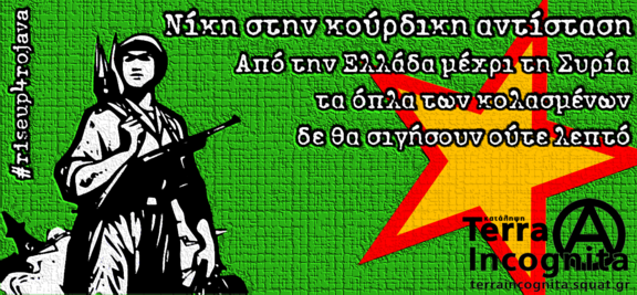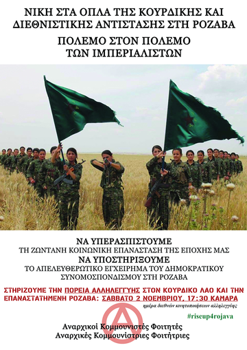 Αναγνωρίζοντας στον αγώνα των ανταρτών και ανταρτισσών στη Συρία, τη δίψα για κοινωνική αλλαγή, τη δίψα για ζωή και το όνειρο της επανάστασης στεκόμαστε αλληλέγγυοι και αλληλέγγυες με κριτική σκέψη αλλά πάνω απ' όλα σεβασμό στη μαχητική διεκδίκηση της αυτονομίας τους, σκεπτόμενοι τη θέση από την οποία μιλάμε και πράττουμε. Ενώνουμε τις φωνές μας απο τα μητροπολιτικά πεδία της Ευρώπης μέχρι τα επαναστατημένα βουνά της Μέσης Ανατολής, φωνάζοντας όλοι μαζί πως τα όπλα των ανταρτισσών και ανταρτών έχουν τις δικές μας σφαίρες. Μεταφέρουμε τον αγώνα τους και τον συνδέουμε με τους δικούς μας αγώνες εντείνοντας τον μοναδικό πόλεμο στον οποίο στρατευόμαστε με όλη μας τη ψυχή. Γιατί η ειρήνη των καταπιεσμένων, θα έρθει μόνο μέσα από τον πόλεμο των τάξεων. Τον πόλεμο για την Επανάσταση και την Αναρχία.