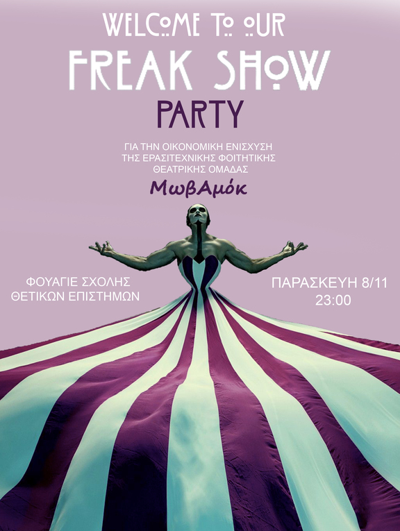 Οι σιαμαίες αδελφές Bette & Dot, το Lobster Boy και ο Twisty Clown περιμένουν να γνωρίσουν τη δική σας freaky πλευρά, αυτήν την Παρασκευή, στο φουαγιέ της Σ.Θ.Ε. Δε θέλετε να τους απογοητεύσετε.