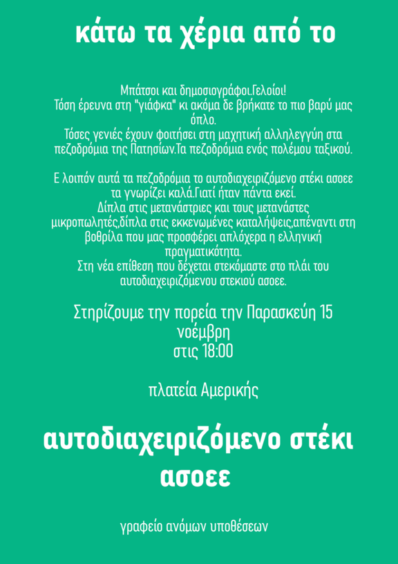 ΚΑΛΕΣΜΑ ΣΤΗΝ ΠΟΡΕΙΑ ΤΟΥ ΑΥΤΟΔΙΑΧΕΙΡΙΖΟΜΕΝΟΥ ΣΤΕΚΙΟΥ ΑΣΟΕΕ ΤΗΝ ΠΑΡΑΣΚΕΥΗ 15/11 ΣΤΙΣ 18:00 ΣΤΗΝ ΠΛΑΤΕΙΑ ΑΜΕΡΙΚΗΣ