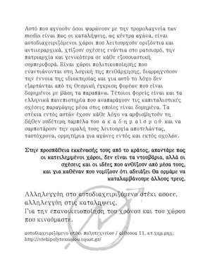 Στην προσπάθεια εκκένωσής τους από το κράτος, απαντάμε πως οι κατειλημμένοι χώροι, δεν είναι τα ντουβάρια, αλλά οι σχέσεις και οι ιδέες που ανθίζουν από μέσα τους. Και για καθέναν που νομίζουν ότι αδειάζει θα ορμάμε να καταλαμβάνουμε άλλους τρείς.