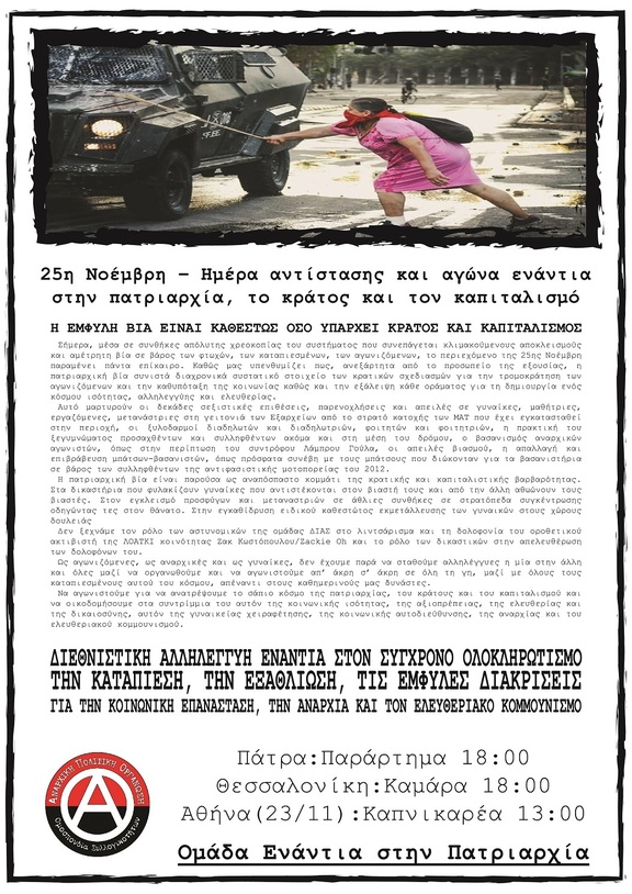 H 25η Νοέμβρη, η οποία έχει οριστεί από τον ΟΗΕ, ως η παγκόσμια ημέρα για την εξάλειψη της βίας κατά των γυναικών είναι στην πραγματικότητα μια ακόμα εκδήλωση της κτηνωδίας του κρατικού και καπιταλιστικού συστήματος απέναντι σε αντιστεκόμενες γυναίκες: στις 25 Νοέμβρη του 1960 δολοφονήθηκαν μετά από άγρια βασανιστήρια τρεις αντιδικτατορικές αγωνίστριες, οι αδερφές Μινέρβα, Πάτρια και Μαρία-Τερέζα Μιραμπάλ, από τους άντρες της ασφάλειας του δικτάτορα Τρουχίγιο στον Άγιο Δομίνικο. Σήμερα, μέσα σε συνθήκες απόλυτης χρεοκοπίας του συστήματος που συνεπάγεται κλιμακούμενους αποκλεισμούς και αμέτρητη βία σε βάρος των φτωχών, των καταπιεσμένων, των αγωνιζόμενων, το περιεχόμενο της 25ης Νοέμβρη παραμένει πάντα επίκαιρο. Καθώς μας υπενθυμίζει πως, ανεξάρτητα από το προσωπείο της εξουσίας, η πατριαρχική βία συνιστά διαχρονικά συστατικό στοιχείο των κρατικών σχεδιασμών για την τρομοκράτηση των αγωνιζόμενων και την καθυπόταξη της κοινωνίας καθώς και την εξάλειψη κάθε οράματος για τη δημιουργία ενός κόσμου ισότητας, αλληλεγγύης και ελευθερίας. Σε αυτούς τους σχεδιασμούς, οι δυνάμεις και οι μηχανισμοί καταστολής επιστρατεύονται για να πειθαρχήσουν και να συμμορφώσουν μεταξύ άλλων όσες γυναίκες επέλεξαν και ως τέτοιες να αντισταθούν στην βαρβαρότητα της εξουσίας ή εκ των υστέρων για να τη νομιμοποιήσουν και διασφαλίσουν την ατιμωρία των υπεύθυνων. Επιπλέον, η σεξιστική βία ως μέθοδος των σωμάτων ασφαλείας αποτελεί δομικό στοιχείο της κρατικής καταστολής σε βάρος των αγωνιζόμενων, ως εργαλείο που αποσκοπεί στην τρομοκράτηση και την ταπείνωση.