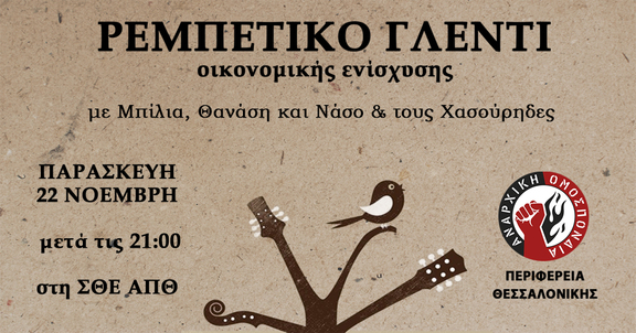 Ρεμπέτικο γλέντι οικονομικής ενίσχυσης της Περιφέρειας Θεσσαλονίκης της Αναρχικής Ομοσπονδίας για την κάλυψη δικαστικών (και πολλών άλλων) εξόδων, με τους Χασούρηδες & τους Μπίλια, Θανάση & Νάσο. Την Παρασκευή 22 Νοέμβρη μετά τις 21:00.