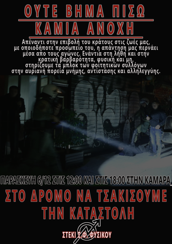 Αγώνας ενάντια στην επιχειρούμενη, αστυνομική καταστολή, τα τελεσίγραφα, τις παρακολουθήσεις συντρόφων και τις εκκενώσεις καταλήψεων. Για τις κοινωνικές - ταξικές αντιστάσεις εντός και εκτός πανεπιστημίου, για την Αλληλεγγύη στις Καταλήψεις, τα Στέκια και τον Κόσμο του Αγώνα.