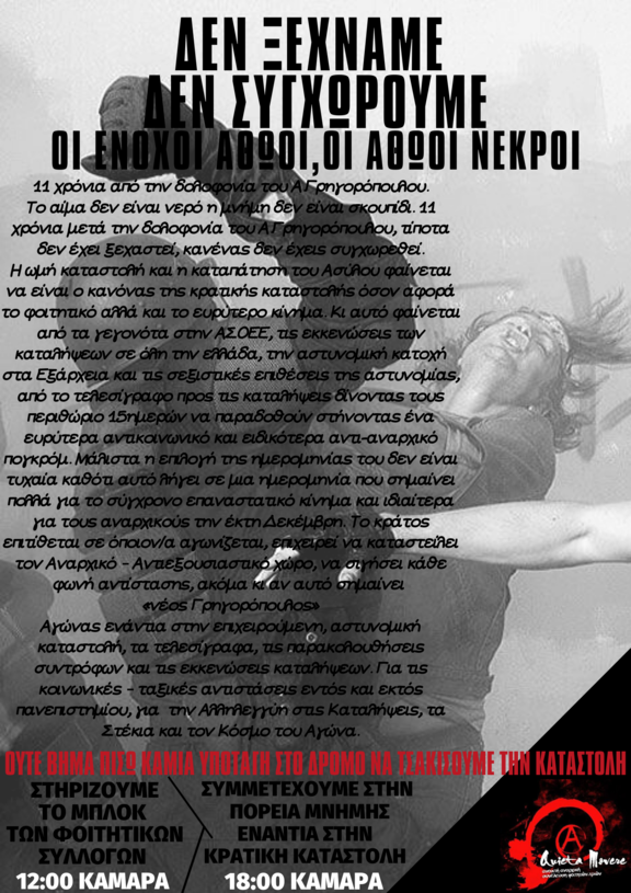 Το αίμα δεν είναι νερό η μνήμη δεν είναι σκουπίδι. 11 χρόνια μετά την δολοφονία του Α.Γρηγορόπουλου, τίποτα δεν έχει ξεχαστεί, κανένας δεν έχει συγχωρεθεί.
