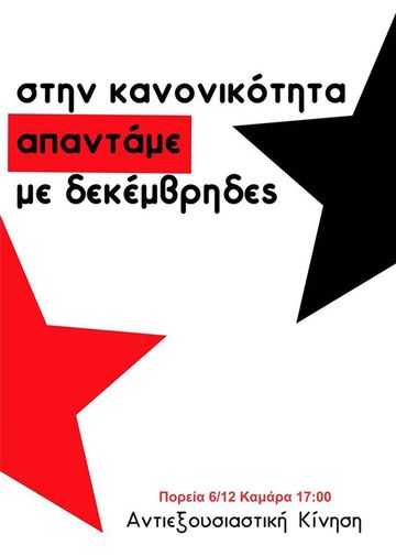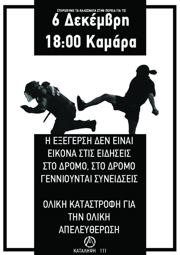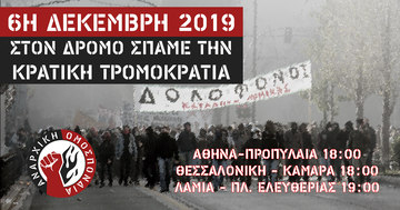 Καλούμε κάθε καταπιεσμένο και εκμεταλλευόμενο να συμμετάσχει στις διαδηλώσεις στις 6 Δεκεμβρίου, για να δώσουμε συλλογικά ένα σαφές μήνυμα αντίστασης απέναντι στην ολομέτωπη επίθεση που εξαπολύουν ενάντια στην κοινωνική βάση και τον κόσμο του αγώνα το κράτος και τα αφεντικά. Ραντεβού στους δρόμους, για να σπάσουμε το κλίμα της τρομοκρατίας που οι κυρίαρχοι προσπαθούν να επιβάλλουν, φοβούμενοι πως οι ημέρες αφθονίας τους στερεύουν, καθώς ήδη έχει αρχίσει η αντίστροφη μέτρηση για την επόμενη λαϊκή εξέγερση ή κοινωνική επανάσταση που θα επιζητήσει την καθολική ανθρώπινη χειραφέτηση και τη γενικευμένη κοινωνική αυτοδιεύθυνση.