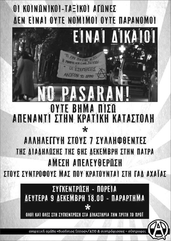 Συγκέντρωση-πορεία αλληλεγγύης: Δευτέρα,9/12 στις 18:00 στην Κατάληψη Παραρτήματος