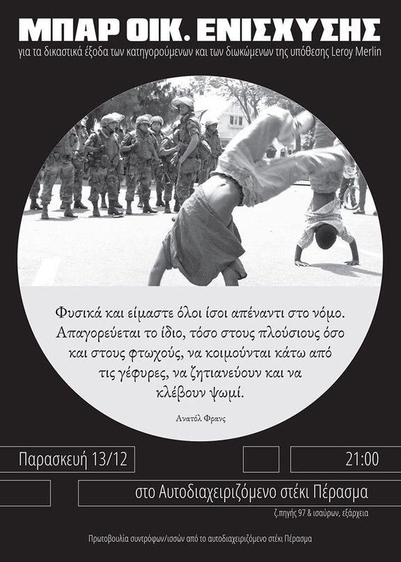 Την Παρασκευή 13 Δεκεμβρίου από τις 9μμ και μετά, στο αυτοδιαχειριζόμενο στέκι Πέρασμα πραγματοποιείται bar οικονομικής ενίσχυσης για τα δικαστικά έξοδα των κατηγορούμενων και διωκόμενων της υπόθεσης Leroy Merlin. Συνολική ενημέρωση για την υπόθεση υπάρχει εδώ.