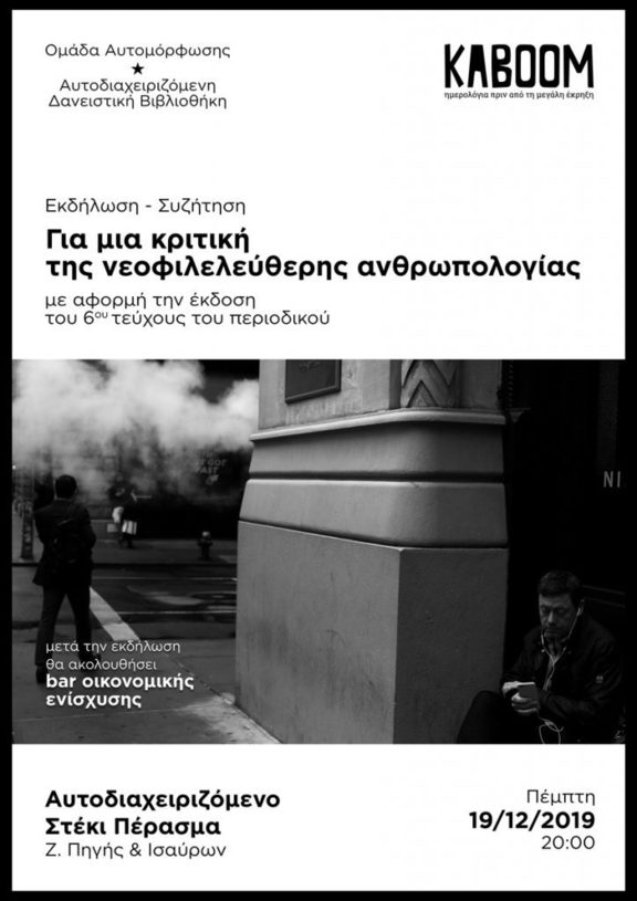 Την Πέμπτη 19 Δεκεμβρίου στις 20:00, η Ομάδα Αυτομόρφωσης και Βιβλιοθήκης του Αυτοδιαχειριζόμενου Στεκιού Πέρασμα (Ζωοδόχου Πηγής και Ισαύρων) διοργανώνει εκδήλωση για την παρουσίαση του νέου τεύχους του περιοδικού Kaboom.