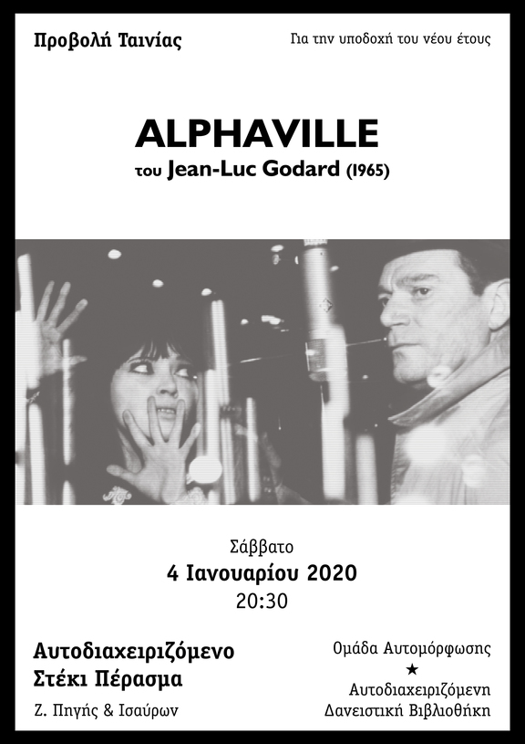 Η Ομάδα Αυτομόρφωσης και Βιβλιοθήκης του Αυτοδιαχειριζόμενου Στεκιού Πέρασμα διοργανώνει προβολή της ταινίας Alphaville του Jean-Luc Godard, για να μπει καλά ο νέος χρόνος.