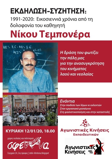 Eκδήλωση - Συζήτηση: 29 χρόνια από τη δολοφονία του Ν.Τεμπονέρα