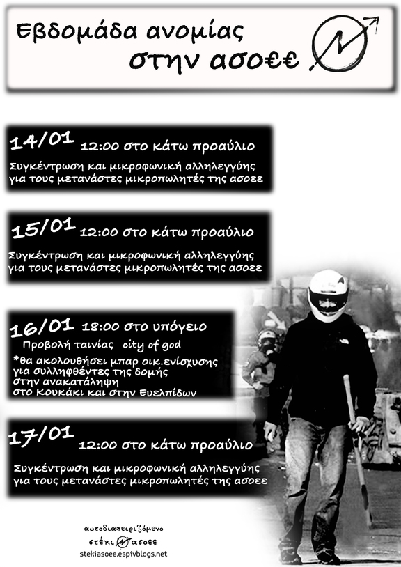 Από την αρχή την χρονιάς τις πρώτες κιόλας μέρες που ξεκίνησε η λειτουργία του πανεπιστημίου σε συννενόηση με τους μετανάστες μικροπωλητές σταθήκαμε καθημερινά για αρκετές ώρες στο πεζοδρόμιο μπροστά από την είσοδο της σχολής με σκοπό την στήριξη τους . Οι παρουσία των μπάτσων είναι καθημερινή χωρίς όμως να παρεμβαίνουν ιδιαίτερα απλά κάνοντας σαφή την προσπάθεια τους να στρατοπεδεύσουν την γειτονιά και το πανεπιστήμιο . Καλούμε για την επόμενη βδομάδα σε μικροφωνικες και πολιτικές εκδηλώσεις με σκοπό την έμπρακτη αλληλεγγύη στους μετανάστες μικροπωλητές.