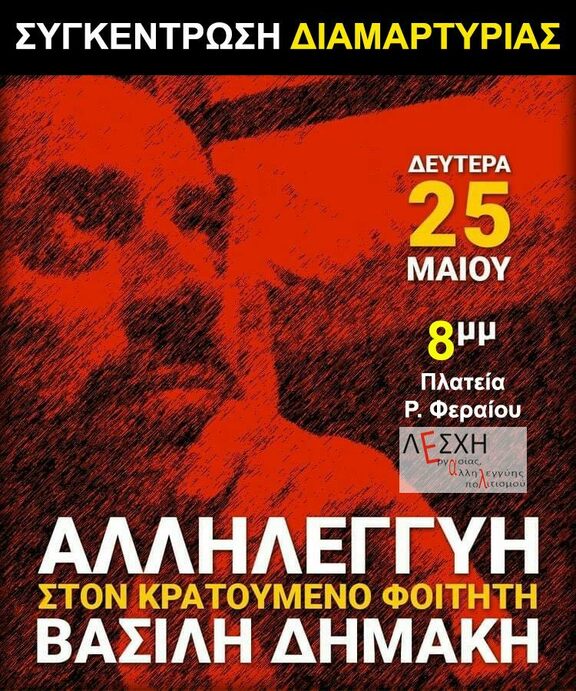 Η Λέσχη Εργασίας Αλληλεγγύης και Πολιτισμού καλεί σε Συγκέντρωση Αλληλεγγύης στον Βασίλη Δημάκη τη Δευτέρα, 25 Μαΐου 2020 στις 8 το βράδυ στην πλατεία Ρήγα Φεραίου.