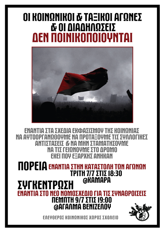 Όσο «δημοκρατικό» προφίλ κι αν θέλει να προωθεί για τον εαυτό του, ένα κράτος είναι πάντα έτοιμο να καταστείλει -τις περισσότερες φορές με χρήση ακραίας βίας- οτιδήποτε απειλεί την ύπαρξή του και τα οικονομικά συμφέροντα που αυτό υπερασπίζεται. Ο λεγόμενος εκδημοκρατισμός της Μεταπολίτευσης δεν ήταν ποτέ μια νέα αρχή, αλλά μια συνέχεια οικονομικής ευημερίας της ελίτ και καταπιέσεων της κοινωνικής βάσης, με την παροχή κυρίως ατομικών ελευθεριών και μιας ψευδαίσθησης ότι καθένας είναι ελεύθερος να καθορίσει το μέλλον του. Όταν οι αντιδράσεις όμως των από τα κάτω εντείνονται ή πρόκειται να ενταθούν στο άμεσο μέλλον, ένα νομοσχέδιο που με διατάξεις που μοιάζουν με μετάφραση από την καθαρεύουσα του αντίστοιχου νομοσχεδίου της χούντας για τις συναθροίσεις είναι απαραίτητο να ποινικοποιήσει τη διαδήλωση, να καθηλώσει την κοινωνική αντίδραση και να εκφοβίσει κάθε υποκείμενο, ατομικό και συλλογικό, που θέλει να αντισταθεί στην υποβάθμιση των ζωών μας.