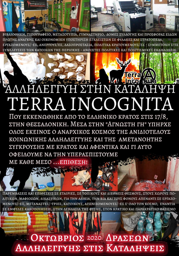 Καλούμε σε ανοιχτή συνέλευση την πέμπτη 6/9/2020 στην ΑΣΟΟΕ στις 7 για την προπαγάνδιση του Οκτώβρη ως μήνας αλληλεγγύης στην κατάληψης Terra Incognita αλλά και κάθε κατειλλημένο έδαφος. Θα ακολουθήσει κουβέντα για την οργάνωση δράσεων στα πλαίσια του Οκτώβρη.