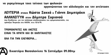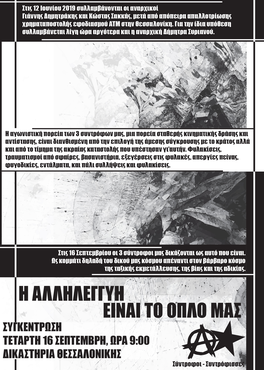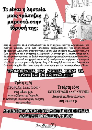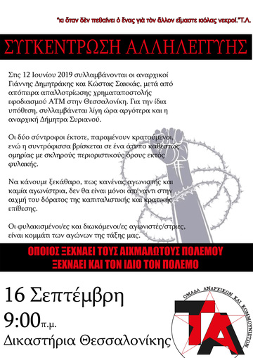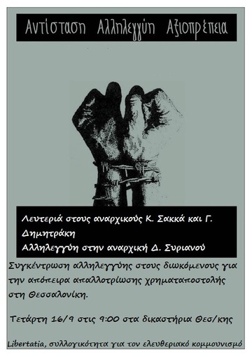 Την Τετάρτη 16 Σεπτεμβρίου στα δικαστήρια της Θεσσαλονίκης στις 9 πμ ξεκινάει η δίκη των αναρχικών συντρόφων Γ. Δημητράκη, Κ. Σακκά καθώς και της συντρόφισσας Δ. Συριανού για την απόπειρα απαλλοτρίωσης της χρηματαποστολής που θα εφοδίαζε ΑΤΜ στον χώρο του νοσοκομείου ΑΧΕΠΑ.