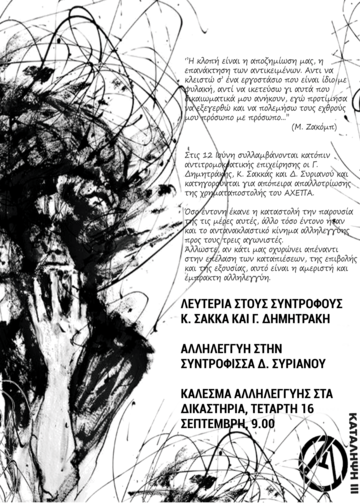 Την Τετάρτη 16/09 και κάθε μέρα στεκόμαστε απέναντι στα δουλικά του κεφαλαίου, μπάτσους και δημοσιογράφους, απέναντι στο κλίμα τρομοκρατίας που αναπαράγουν φυλλάδες και κανάλια, απέναντι σε μία ταξική δικαιοσύνη, δίπλα σε όσους αγωνίζονται για έναν καλύτερο κόσμο.