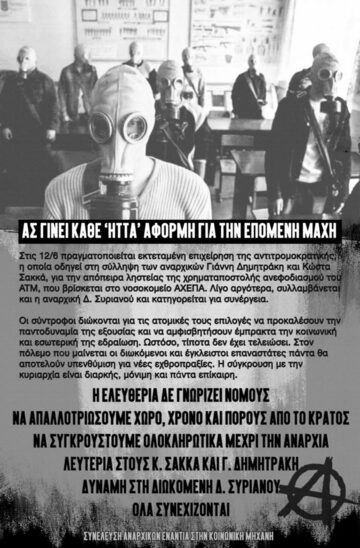 Αναρχικοί/ες σύντροφοι/ισσες για μια ακόμα φορά βρίσκονται στα χέρια του κράτους. Εμείς από την μεριά μας, στεκόμαστε αλληλέγγυοι/ες σε πράξεις επίθεσης σε καπιταλιστικούς στόχους εν γένει. Η αποδοχή της θεσμικής τάξης επιβάλλεται με οξεία ρητορική που ασκεί η κυριαρχία σε όλα τα επίπεδα. Η αφήγηση τους είναι η αφήγηση της εξουσίας όσο και το "δίκιο" τους είναι το δίκαιο της εξουσίας• ας είναι να γκρεμίσουμε αυτόν τον κόσμο με συνεχή αδιάλλακτο και πολύμορφο αγώνα.