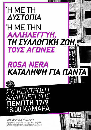 Την Πέμπτη 17/9 στις 18.00 το απόγευμα στην Καμάρα συγκέντρωση αλληλεγγύης στην κατάληψη Rosa Nera που εκκενώθηκε από την αστυνομία στα Χανιά. Ο αγώνας συνεχίζεται με χιλιάδες ανθρώπους να βρίσκονται αλληλέγγυοι στο πλευρό της Rosa Nera σε όλη την Ελλάδα.