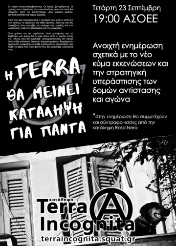 Η κατάληψη Terra Incognita σίγουρα δεν είναι και δεν επιθυμούμε να θεωρείται το κέντρο του κινηματικού σύμπαντος. Μια τέτοια άλλωστε ανάγνωση μόνο ως εγωκεντρική και αντισυντροφική θα μπορούσε να ληφθεί καθώς θα ακύρωνε στην πράξη κάθε άλλο κατασταλτικό χτύπημα. H Terra είναι ακόμα ένα εργαλείο αγώνα που μέσα από τη στρατηγική της συμβάλει στην κοινωνική διάχυση των αναρχικών προταγμάτων και την ένταση του αδιαμεσολάβητου αντικαθεστωτικού αγώνα. Γι' αυτό και ανήκει κοινωνικά, πολιτικά και ιστορικά στα χέρια ολόκληρου του αντιεξουσιαστικού κινήματος που δεκαετίες τώρα μάχεται με όλα τα μέσα, ενάντια στην βαρβαρότητα της εκμετάλλευσης. Αν όμως η κυβέρνηση και κάθε επίδοξος θιασώτης της καθεστωτικής νομιμότητας πιστεύει πως αυτό είναι το τέλος μας, ως κατάληψη, ως αναρχικοί αγωνιστές και αγωνίστριες και ως μαχόμενο κομμάτι της αγωνιζόμενης κοινωνίας επενδύει σε τυφλές ελπίδες.