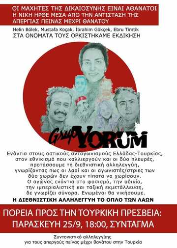 Το καθεστώς του Ερντογάν φοβήθηκε τη δυναμική του αγώνα αυτού που αναπτύχθηκε γιατί ανέδειξε σε όλο τον κόσμο την αδικία και την τρομοκρατία που επικρατεί στο εσωτερικό της Τουρκίας. Μα και συνάμα ανέπτυξε ένα τεράστιο κίνημα αλληλεγγύης σε όλα τα μέρη της γης, που έδωσε δύναμη στον αγώνα των απεργών, από την Τουρκία μέχρι την Ευρώπη και από τη Λατινική Αμερική μέχρι τη Μέση Ανατολή. Ενάντια στους ενδοαστικούς ανταγωνισμούς Ελλάδας- Τουρκίας, στον εθνικισμό και των 2 πλευρών, προτάσσουμε τη διεθνιστική αλληλεγγύη, γιατί οι αγωνιστές/τριες και οι λαοί των δύο χωρών δεν έχουν τίποτα να χωρίσουν.Ο αγώνας ενάντια στο φασισμό, την αδικία, την ιμπεριαλιστική και ταξική εκμετάλλευση, δε γνωρίζει σύνορα.