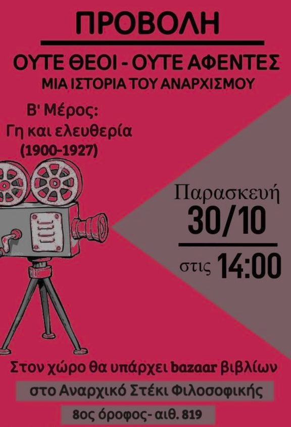 Προβολή του β' μέρους του ντοκιμαντέρ "Ούτε θεοί - Ούτε αφέντες μια ιστορία του αναρχισμού". Στον χώρο του στεκιού θα λειτουργεί bazaar βιβλίων. Παρασκευή 30 /10 στις 14.00.