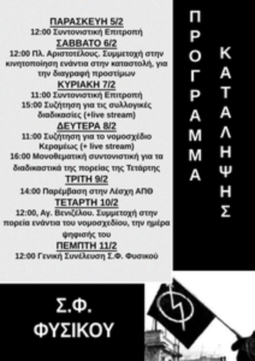Την Πέμπτη 4/2 ο σύλλογος φοιτητ(ρι)ών Φυσικού πραγματοποίησε εξ αναβολής Γενική Συνέλευση. Κατά τη διάρκειά της συζητήθηκε το νομοσχέδιο Κεραμέως για την παιδεία. Στο πνεύμα της εναντίωσής μας στο νομοσχέδιο αποφασίσαμε να προβούμε σε κατάληψη της σχολής, από την Παρασκευή 5/2 έως Πέμπτη 11/2, με παράλληλη αναβολή των εξετάσεων των μαθημάτων και διακοπή της ερευνητικής δραστηριότητας τις αντίστοιχες ημέρες και να συμμετάσχουμε στη διαδήλωση της Τετάρτης, μέρα ψήφισης του νομοσχεδίου.