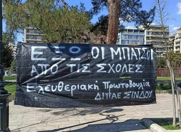 Περιγραφή Εικόνας: Πανό στο Άγαλμα Βενιζέλου « ΕΞΩ ΟΙ ΜΠΑΤΣΟΙ ΑΠΟ ΤΙΣ ΣΧΟΛΕΣ, Ελευθεριακή Πρωτοβουλία ΔΙΠΑΕ ΣΙΝΔΟΥ»