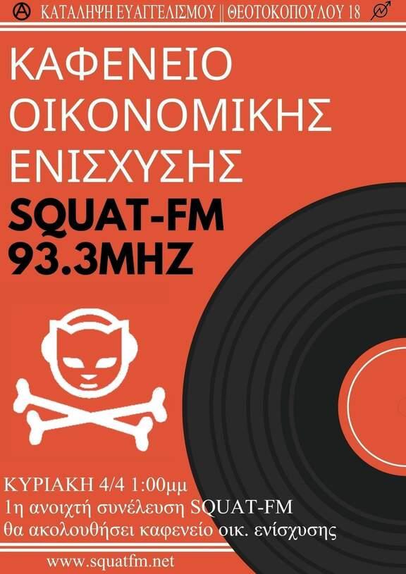 Ο Ραδιοφωνικός σταθμός SQUAT FM καλεί την Κυριακή 4/4 στης 13:00 την πρώτη ΑΝΟΙΚΤΗ ΣΥΝΕΛΕΥΣΗ στην κατάληψη Ευαγγελισμου, να γνωριστούμε και να δούμε πως θα διαμορφωθεί η δημόσια απευθύνση (μουσικές, εκπομπές κτλ) περα από τα τεχνικά.Θα ακολουθήσει ΚΑΦΕΝΕΙΟ για την οικονομική ενίσχυση του σταθμού.
