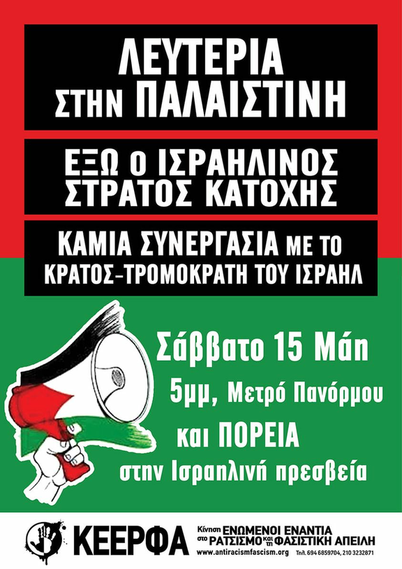 LEFTERIA IN PALESTINI! We demonstrate Saturday May 15, 5. 00 pm Panormos Metro and march at the Israel Embassy - Lefteria in Palestine - Victory in Indifanda - Israeli occupation army out! - No cooperation with the terrorist state of Israel. The reactionary axis of Greece - Cyprus - Israel - Egypt should be dismantled. We denounce the murderous policy of the terrorist state of Israel in East Jerusalem and Gaza. 24 Palestinians, including 9 children, have died from Israeli army attacks within 3 days. 610 protesters injured in East Jerusalem by violent police attacks at demonstrations of tens of thousands of Palestinians but also during invasion of Al Aksa Mosque amid Ramadan. We salute Palestinians who stand up to Israel's racist apartheid state continuing settlement policy and trying to kick them out of East Jerusalem's Sheikh Jara district with violent evictions. We are in solidarity with their struggle from East Jerusalem to Gaza and West Bank. The resistance of the Palestinian people gives strength and raises the working class and youth from Beirut to Baghdad and from Damascus to Cairo. This is also the force that can put an end to the plans of the imperialists and their watchdog in the area. We condemn the provocative attitude of the Greek government, which rushed to correct its original announcement that spoke of ′′ violent episodes ′′ with a second condemning the ′′ missile attacks on civilian population in Israel ′′ and recognizing ′′ Israel's right to self-defense "! Her attitude surprises no one. The ND government, like the previous SYRIZA government, has declared Israel a key ally in the region. She sets up her reactive axis with right-wing Netanyahu and Egyptian dictator al Sisi on the corpses of Palestinians fighting for freedom. KEERFA together with Palestinian organizations, immigrants and refugees calls for mass participation in the demonstration of solidarity with the Palestinian people on Saturday, May 15, 5 pm Panormos Metro and march at the Israel Embassy.