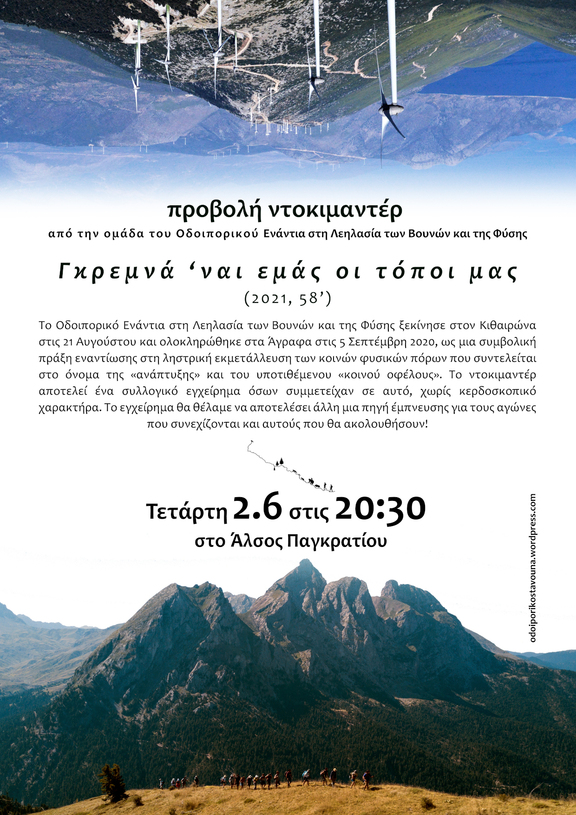 Προβολή του ντοκιμαντέρ Γκρεμνά 'ναι εμάς οι Τόποι μας, της ομάδας του Οδοιπορικού Ενάντια στη Λεηλασία των Βουνών και της Φύσης. Θα ακολουθήσει συζήτηση γύρω από το εγχείρημα και την εμπειρία.