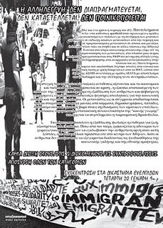 Τη στιγμή που οι κοινωνικές-ταξικές αντιθέσεις οξύνονται και το οικονομικό και πολιτικό σύστημα βρίσκεται σε κρίση, η εξουσία αποποιούμενη των ευθυνών της για την επιταχυνόμενη εξαθλίωση των ανθρώπων και φοβούμενη επερχόμενες εξεγέρσεις, κατασκευάζει φιγούρες απειλητικές για την κοινωνική ευταξία και την εθνική ενότητα. Οι μετανάστες, ως οι σύγχρονοι αποδιοπομπαίοι τράγοι, στοχοποιούνται μετά μανίας από κόμματα, δημοσιογράφους, παπάδες, διανοούμενους και γίνονται βορά στους σχεδιασμούς των κρατικών επιτελείων, τους οποίους νομιμοποιεί η υποτακτική συναινετικότητα της «κοινής γνώμης» και έρχεται να συμπληρώσει η παρακρατική θρασυδειλία.