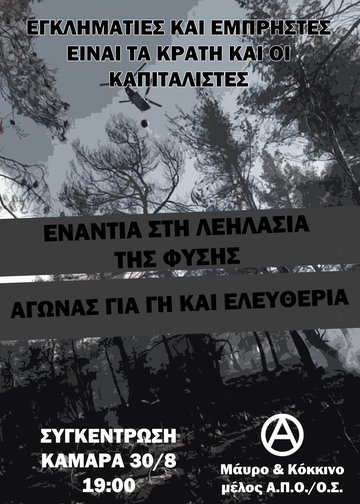 Μέσα, όμως, από όλη αυτή τη δύσκολη συνθήκη αναδύθηκε η κοινωνική αλληλεγγύη και η αλληλοβοήθεια προς τους ανθρώπους που επλήγησαν από την καταστροφική μανία των πυρκαγιών και την εγκληματική αδιαφορία του κράτους. Μια αλληλεγγύη που εκδηλώθηκε με διάφορους τρόπους, με συλλογές ειδών πρώτης ανάγκης, με κινήσεις αλληλεγγύης στον δρόμο, με φυσική παρουσία στα πύρινα μέτωπα για να βοηθηθεί το έργο της κατάσβεσης. Εξίσου σημαντικά είναι και τα στοιχεία αυτοοργάνωσης που αναδείχθηκαν από τις τοπικές κοινωνίες σε μια συνθήκη εγκατάλειψής τους από το κράτος μπροστά σε μια μεγάλη καταστροφή. Τώρα που τα φώτα της δημοσιότητας αποχωρούν από τις πληγείσες περιοχές, είναι η στιγμή ενίσχυσης των κατοίκων και των αιτημάτων τους για άμεσα αντιπλημμυρικά έργα και για φυσική αναδάσωση από τους ίδιους τους ανθρώπους που ξέρουν και δουλεύουν στα δάση αυτά. Είναι σημαντικό να στηριχθούν οι αγώνες των κατοίκων των περιοχών ενάντια στη λεηλασία της φύσης από κράτος και κεφάλαιο, αγώνες που θεωρούμε σημαντικό να προτάσσονται τα αναρχικά χαρακτηριστικά, αυτά της αλληλεγγύης, της αλληλοβοήθειας και της οργάνωσης στη βάση ενάντια στην κρατική και καπιταλιστική εγκληματικότητα.