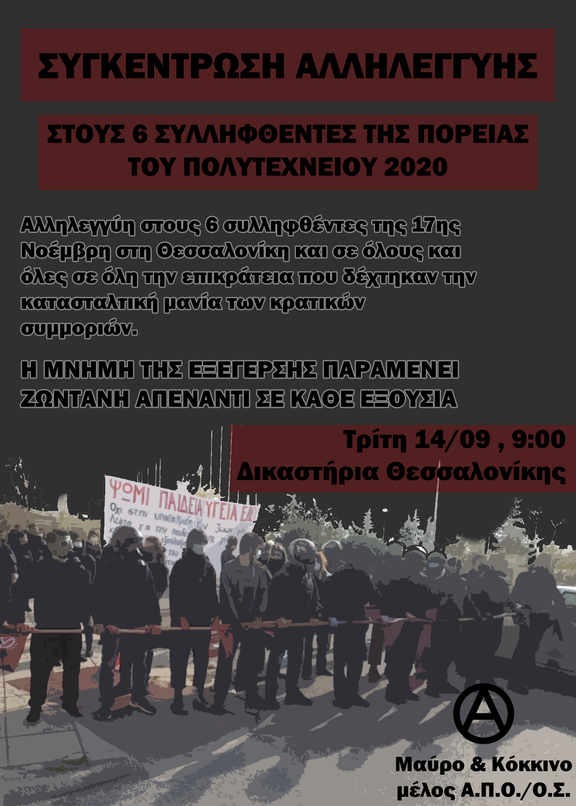 ΣΥΓΚΕΝΤΡΩΣΗ ΑΛΛΗΛΕΓΓΥΗΣ ΣΤΟΥΣ ΣΥΛΛΦΘΕΝΤΕΣ ΤΗΣ ΠΟΡΕΙΑΣ ΤΟΥ ΠΟΛΥΤΕΧΝΕΙΟΥ | ΤΡΙΤΗ 14/09, 09:00 ΔΙΚΑΣΤΗΡΙΑ ΘΕΣ/ΝΙΚΗΣ